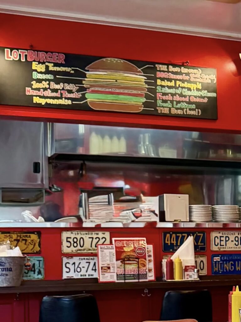カウンター席の上に名物ロットバーガーの絵が描かれている。